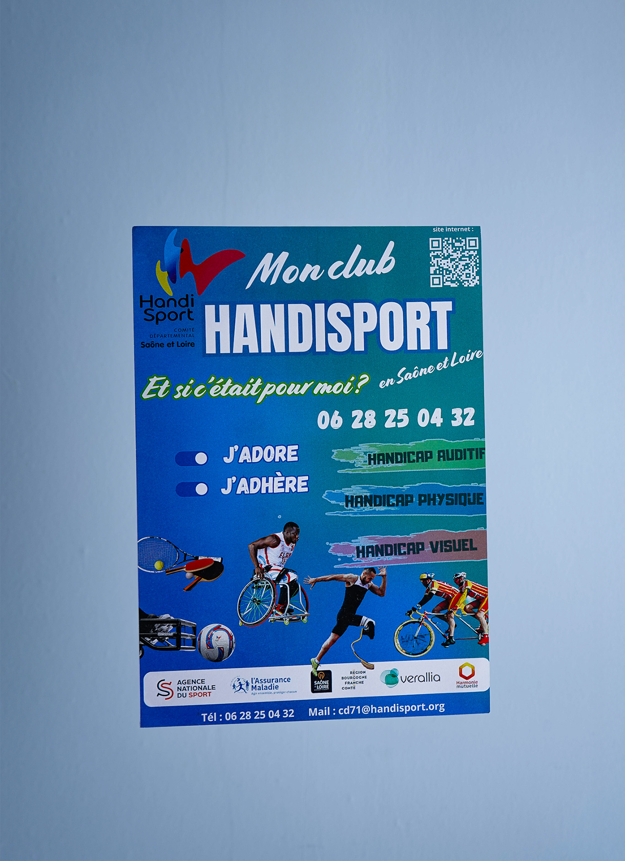 J’ai réalisé cette affiche afin de permettre au public en situation de handicap de trouver facilement un club handisport en Saône-et-Loire. Elle met en avant les différentes pratiques possibles (handicap auditif, physique et visuel) ainsi que les coordonnées du comité départemental Handisport pour faciliter la prise de contact.