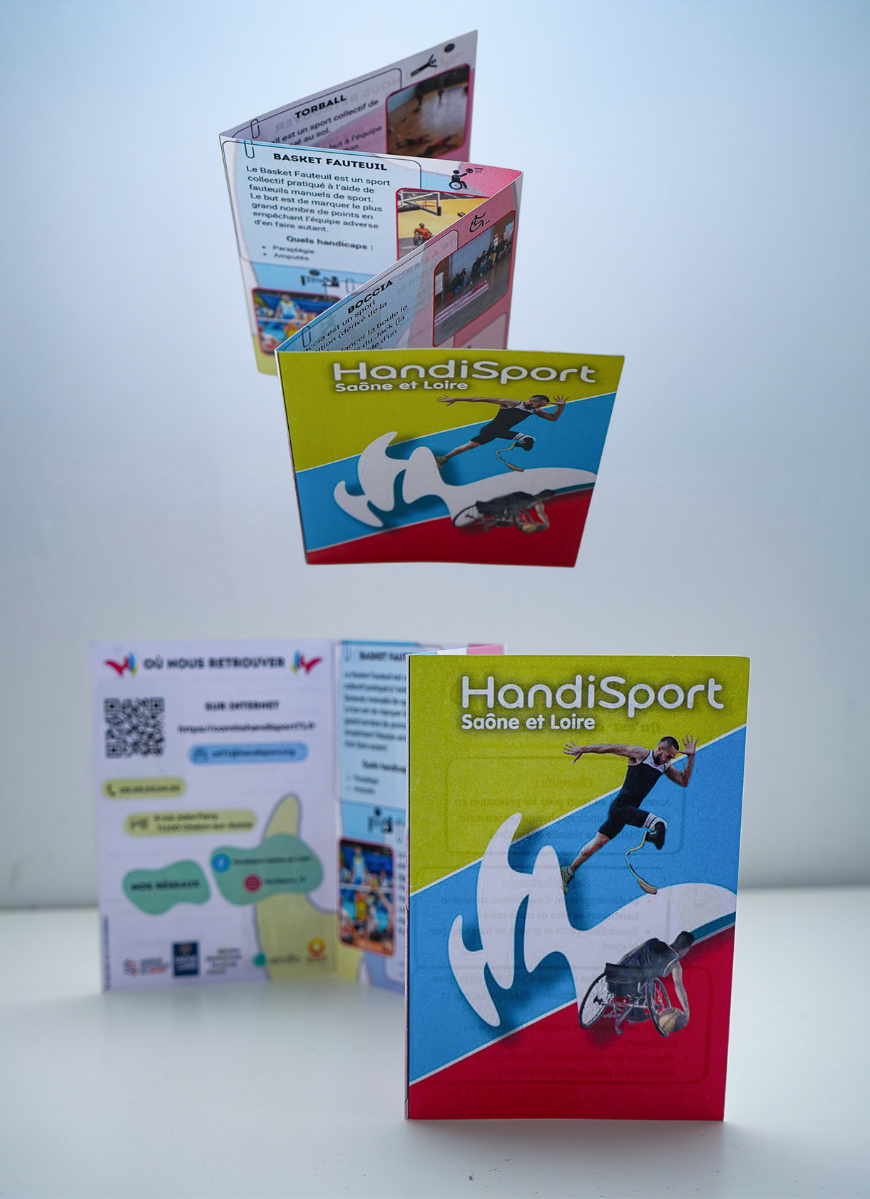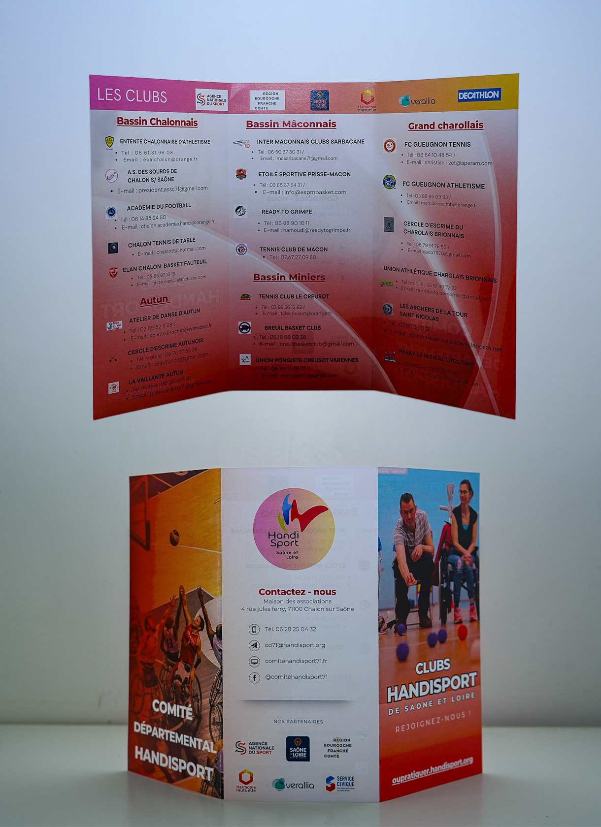J’ai également réalisé ce dépliant qui recense l’ensemble des clubs handisport de Saône-et-Loire. Il permet au public en situation de handicap de trouver facilement une structure adaptée près de chez lui, grâce à une présentation organisée par bassins et accompagnée des contacts utiles.